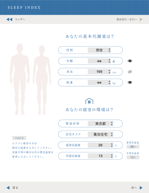 個々人の代謝量・室温から睡眠し数を導き出し、