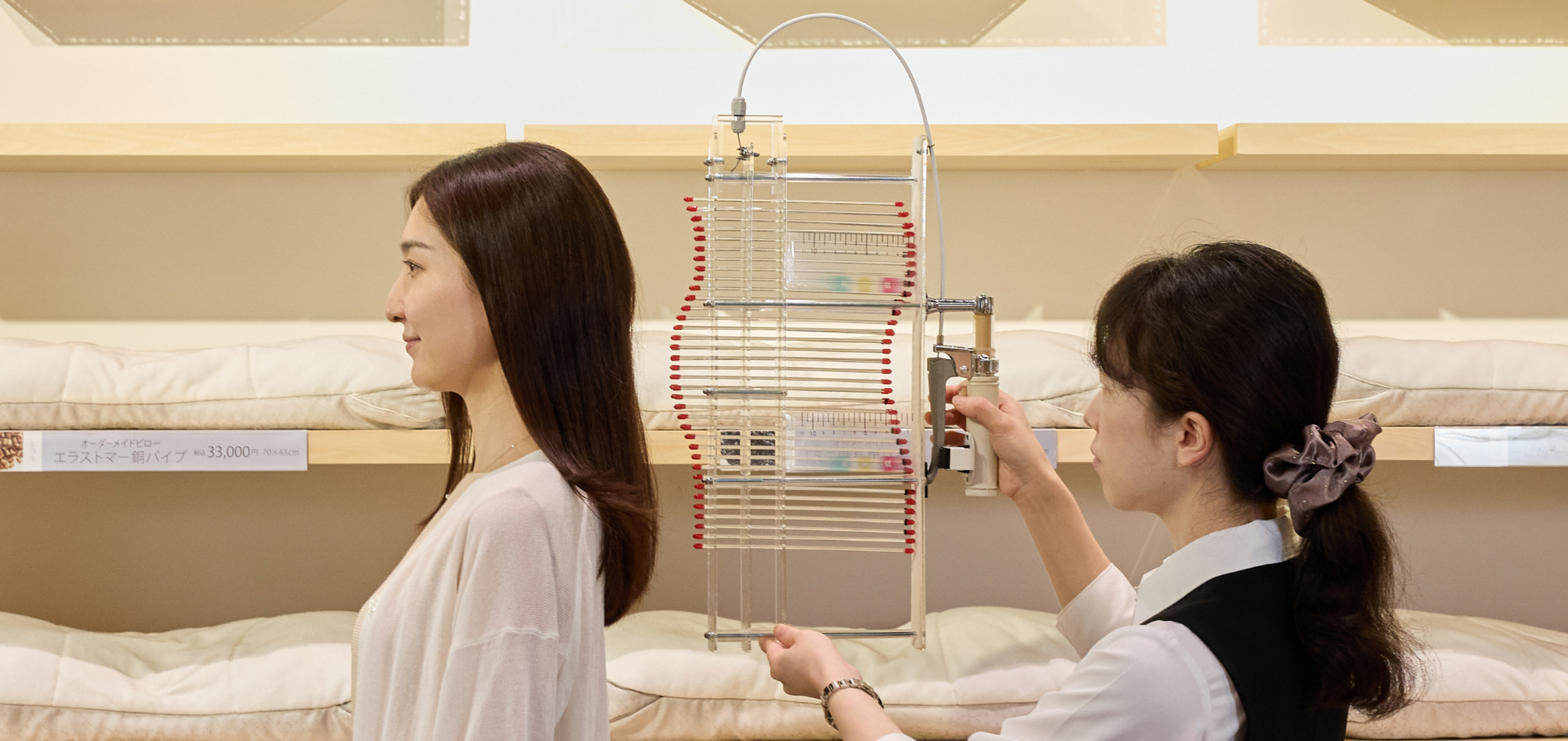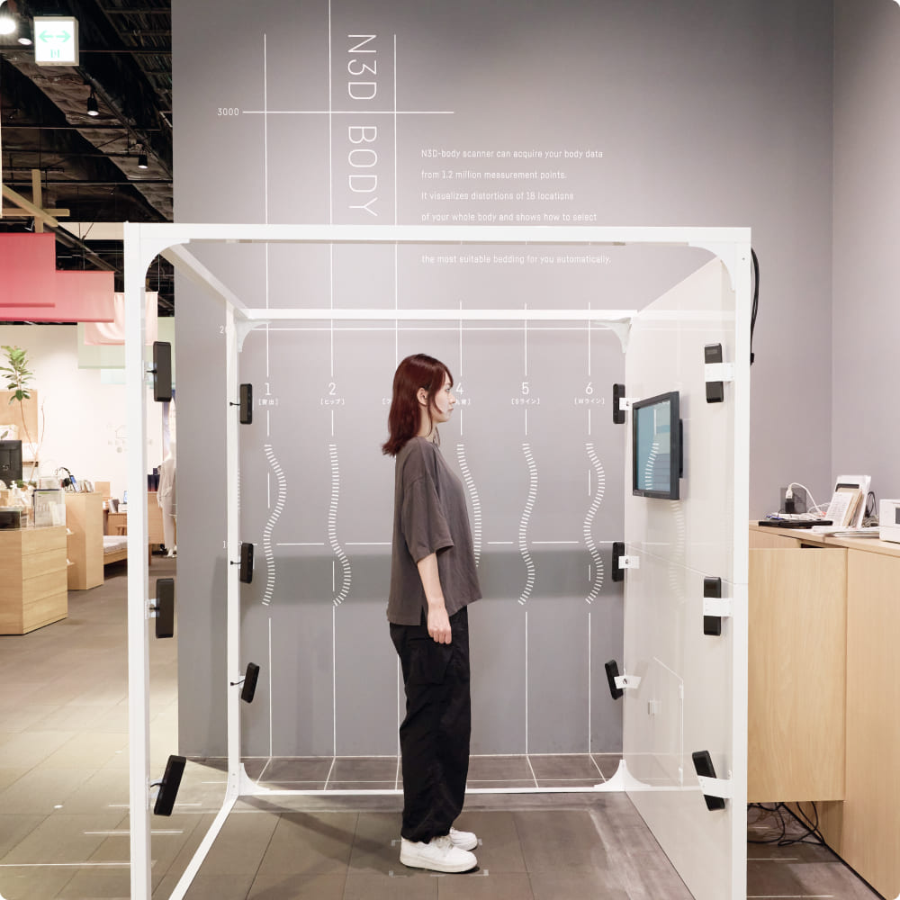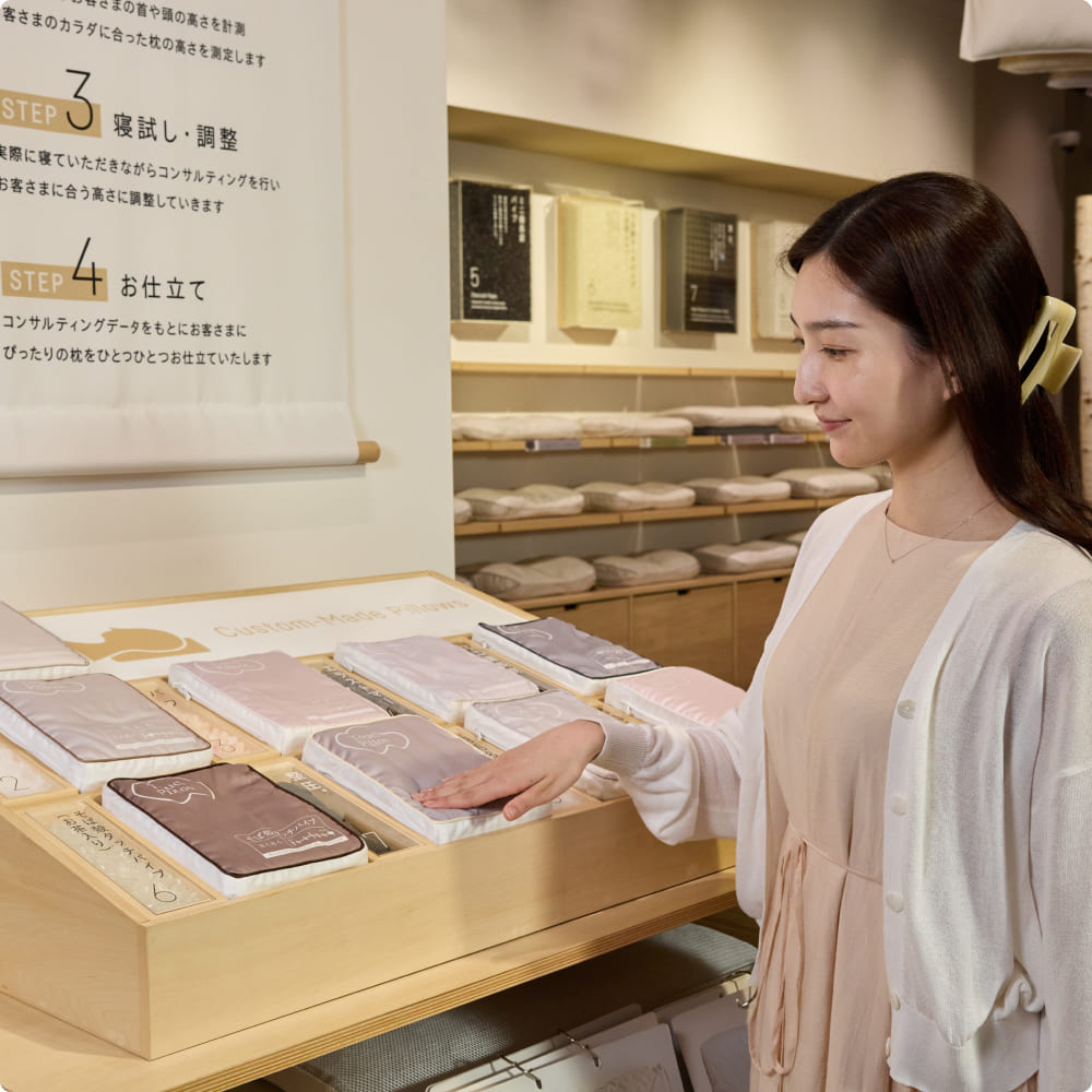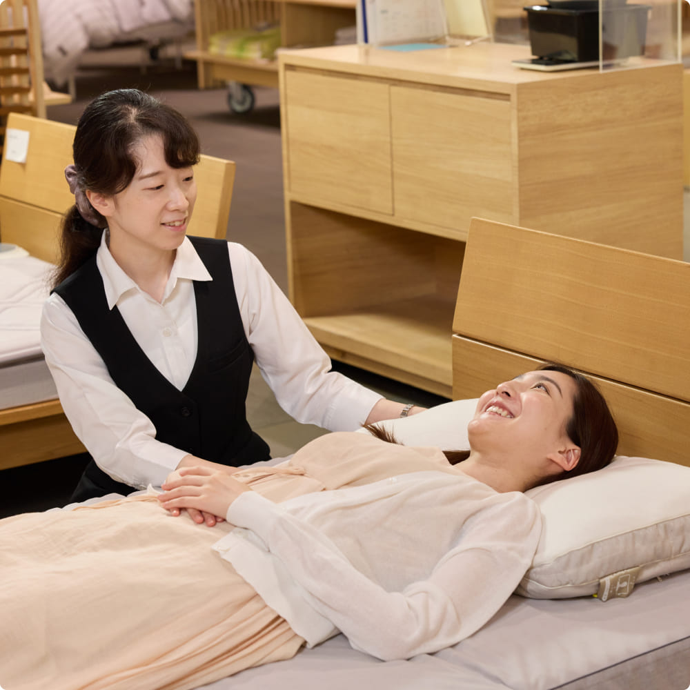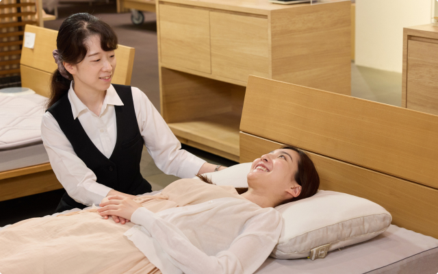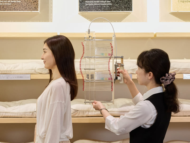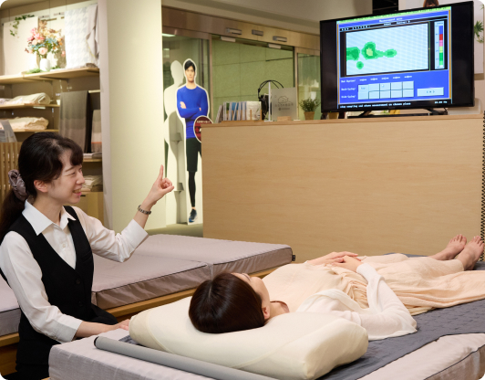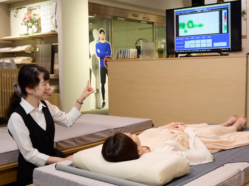 はい。オーダーメイド枕やマットレスの体感スペースを設けています。測定結果をもとに実際の寝心地を試すことで、納得のいく商品選びができます。試し寝の際はスタッフが姿勢を確認し、最適な高さを提案します。