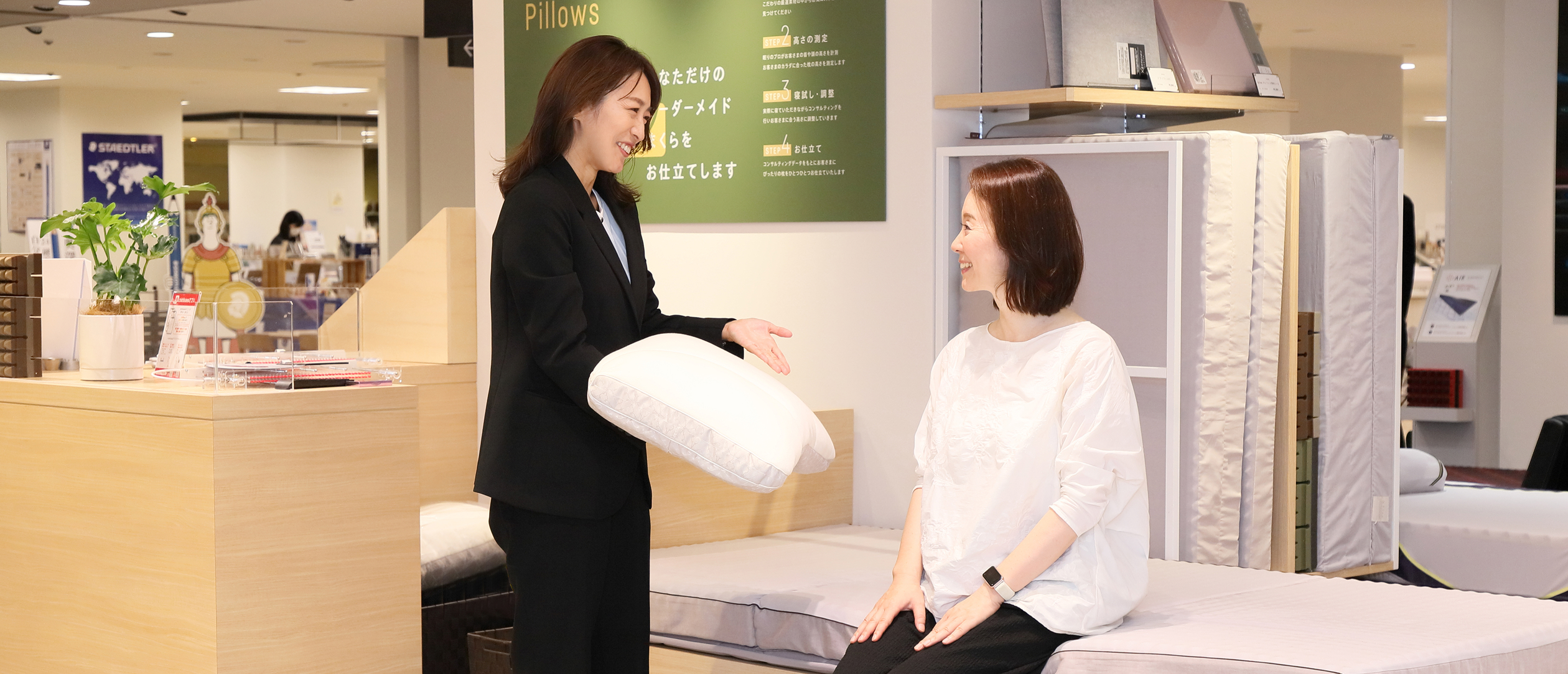 睡眠科学や快眠環境などの専門講習を受けた眠りのプロフェッショナル。快適な眠りにつくための環境の整え方や寝具選びをご提案致します。「寝具選び」や「ねむりの悩みの解決方法」は、自分では分からない事が多いもの。「なんだか眠れない」などのお悩みはお気軽にご相談ください。日本橋西川松坂屋名古屋店では、4名在籍のスリープマスターの他、眠りについてのアドバイザーがあなたのお悩みにお応えします。