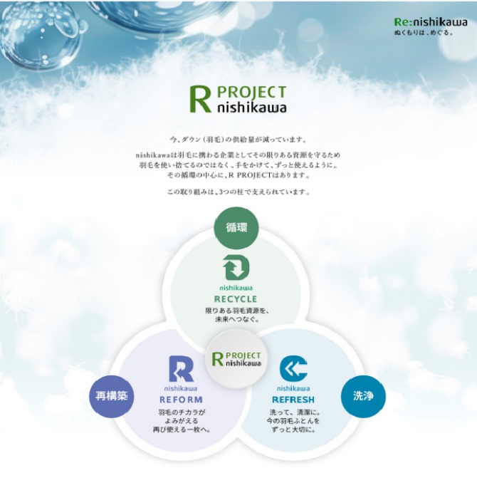 長く使われた羽毛ふとんに、もう一度、命を吹き込む。nishikawaは、眠りに寄り添い続けてきた技術と心で、ぬくもりを未来へつなぐ取り組みを続けています。会期中は、羽毛ふとんのリフォームやリサイクルなど、お使いの羽毛ふとんのご相談を承ります。